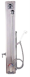 Thermostatic)Leonard's Barrier Free Surfashower® Systems are designed to conply with ADA guidelines for mounting heights operation and clearances. Each factory assembled unit includes a stainless steel shower panel with recessed soap dish, shower valve (either pressure balanced or thermostatic) institutional shower head, lever diverter valve, hand shower, Horizontal-Corner Grab Bar and folding seat. |